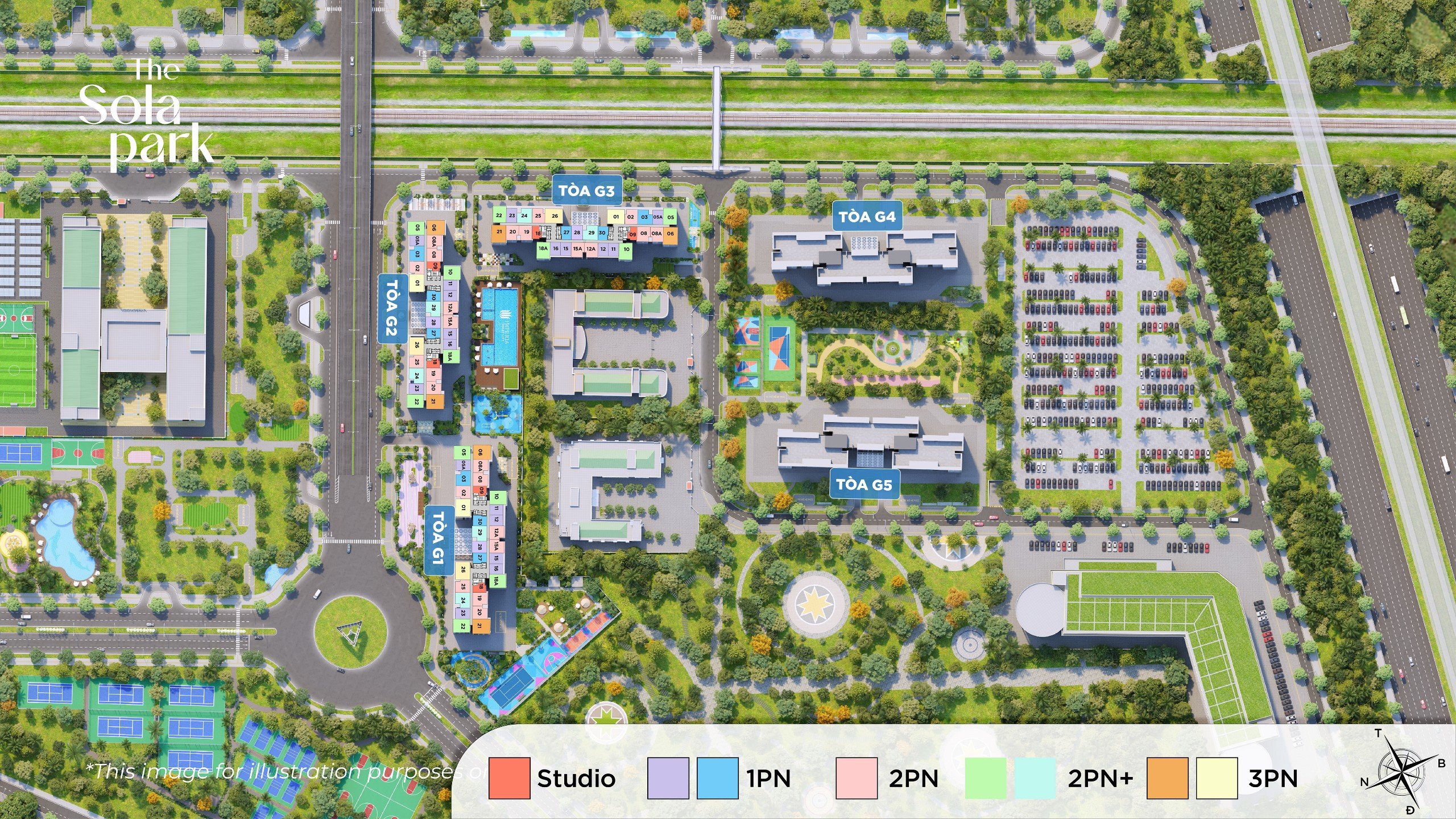 Dự án The Sola Park được xây dựng bao gồm 5 tòa chung cư cao 35- 39 tầng, ở giữa là 2 trường học nhằm mục đích phục vụ nhu cầu học tập của các cư dân nhí trong tương lai. Tòa G4 và G5 được xây dựng đối diện, trong khi đó tòa G1, G2 và G3 được bố trí hình chữ L. Cách sắp xếp này rất hợp lý vừa tối ưu được công năng sử dụng vừa làm tăng số lượng căn góc.